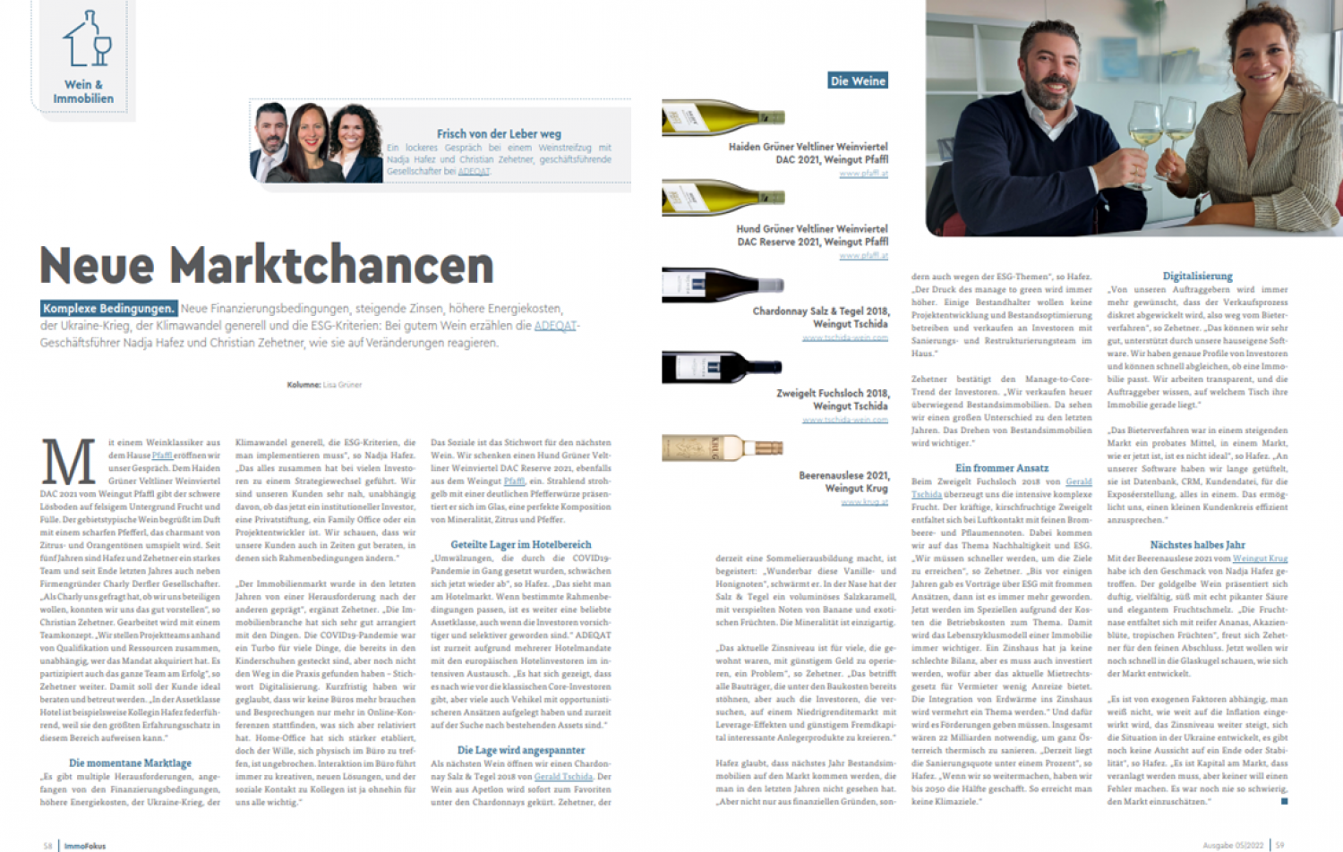 Unsere Geschäftsführer Nadja Hafez und Christian Zehetner erzählen bei gutem Wein im Gespräch mit dem ImmoFokus wie sie auf die aktuellen Veränderungen am Markt reagieren, und welche Chancen das in den verschiedenen Bereichen eröffnet.