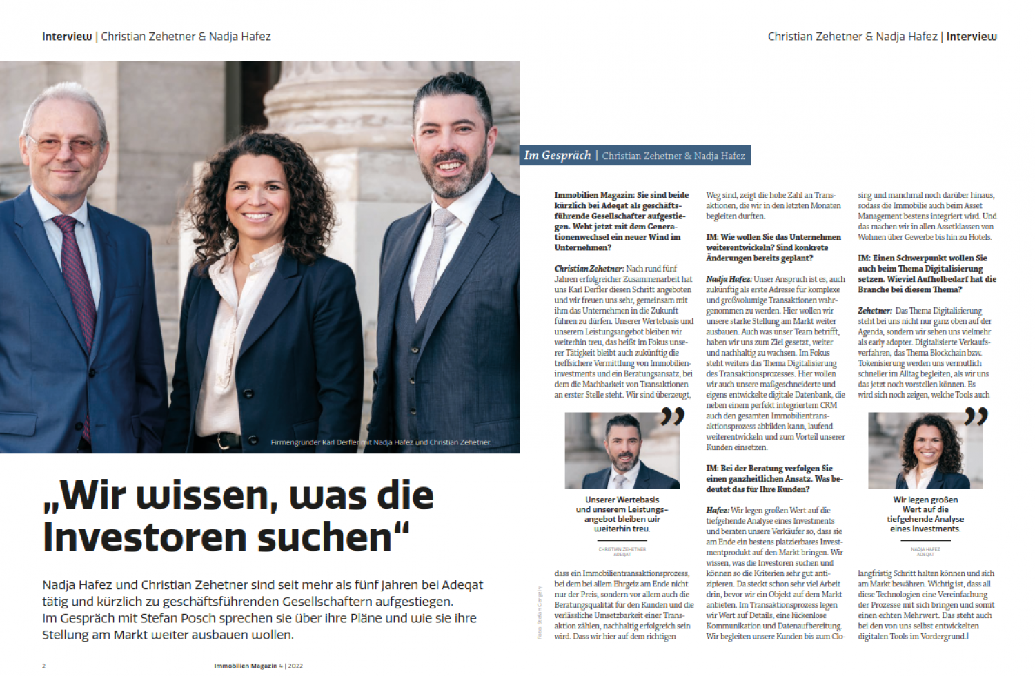 Im Gespräch mit Stefan Posch haben unsere Gesellschafter Nadja Hafez und Christian Zehetner über die weiteren Pläne von ADEQAT gesprochen. Das gesamte Interview sehen Sie in Ausgabe 04.2022 des Immobilien Magazins.